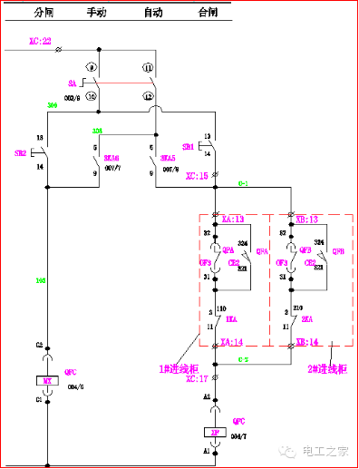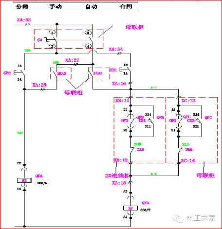在手動操作中:10,000轉SA的1和2條腿連接在一起。當Q2和Q3閉合時,Q1閉合回路A-2和A-3斷開,其閉合線圈XF不能通電,Q1不能滿足閉合條件。同樣,當Q1、Q2或Q1、Q3同時接通時,Q2或Q3也不能滿足切換條件。使進線柜和母聯符合“三合一”的邏輯。
