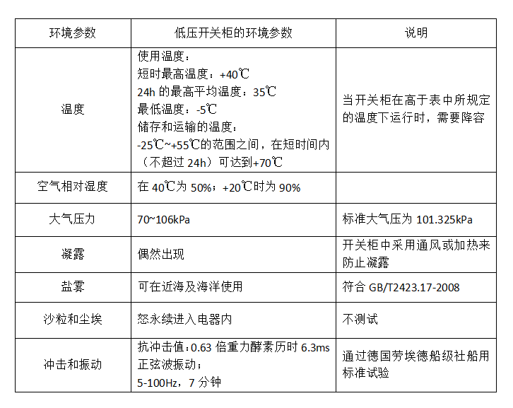 注:表中開關柜的環境參數符合下列標準:IEC6.439-1、EN60439、VDE0660第500部分、GB7251.2005。