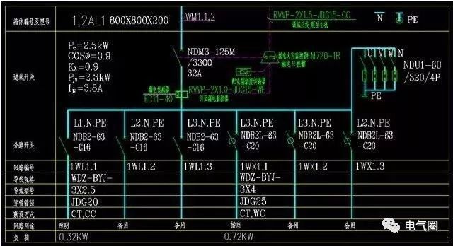 L1。并聯(lián)開關上方的N.PE表示通過從火線的三相中選擇一相,并添加零線和地線,形成一個具有220伏電源的1WL1.1回路。導線規(guī)格WDZ-BYJ-3X2.JDG20-CT,CC指低煙無鹵阻燃交聯(lián)聚乙烯絕緣(銅芯)導線,3根2.5平方毫米,直徑20毫米的金屬管,橋架及沿屋面暗敷設。同時,標記該回路用于照明和備用。照明負載為0.32千瓦,相對較小。